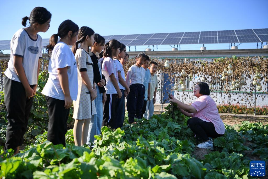 9月13日,河北省樂亭縣新寨鎮蘭坨小學的老師在“校園農場”內指導學生收穫蘿蔔。