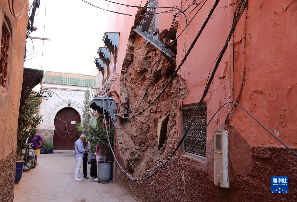 這是9月13日在摩洛哥馬拉喀什老城拍攝的一處震後受損建築。