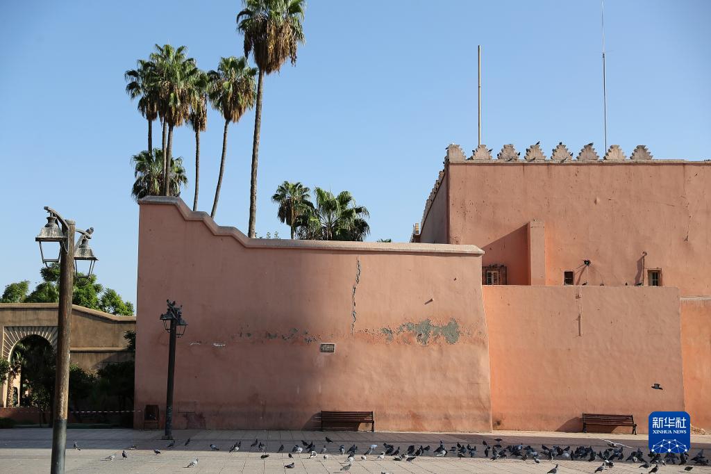 這是9月13日在摩洛哥馬拉喀什老城拍攝的庫圖比亞清真寺外墻。該清真寺目前已暫停開放。