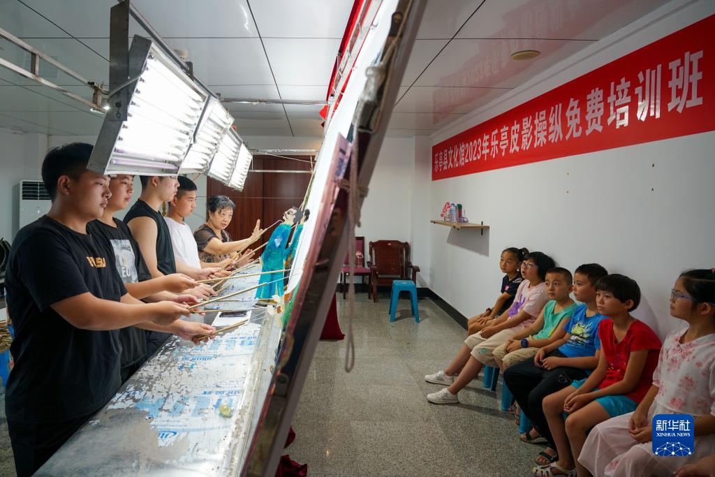 9月13日,學生們在河北省樂亭縣文化館皮影教室內學習皮影表演技巧。