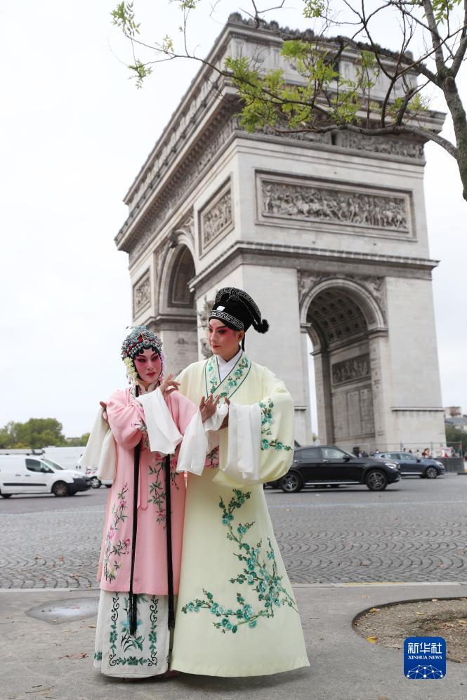 9月13日,江蘇省演藝集團昆劇院院長施夏明(右)和江蘇省演藝集團昆劇院國家一級演員孔愛萍在法國巴黎凱旋門附近參加崑曲快閃。