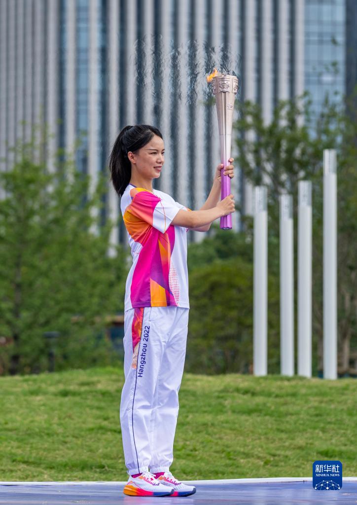 9月14日,在杭州亞運會火炬傳遞台州站起跑儀式現場,火炬手魏夢喜展示火炬。