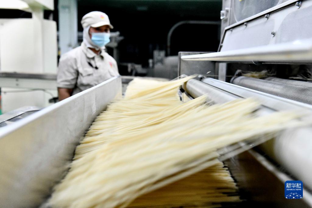 9月12日,在濱州中裕食品有限公司掛麵生産車間,工作人員在流水線上值守。