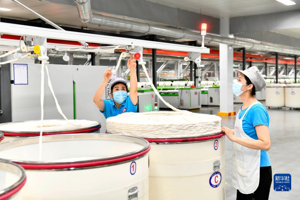 9月13日,在山東宏儒紡織科技有限公司綠色智能化生産車間,工作人員在加工高端紗線。