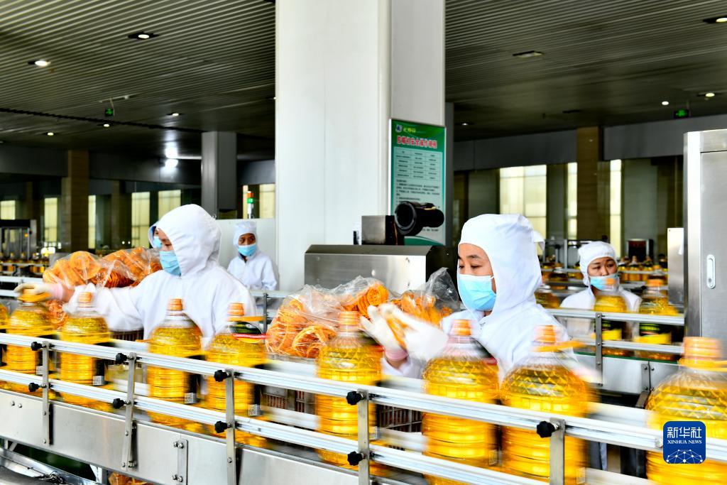 9月13日,在長壽花食品股份有限公司玉米油生産線,工作人員在流水線上作業。