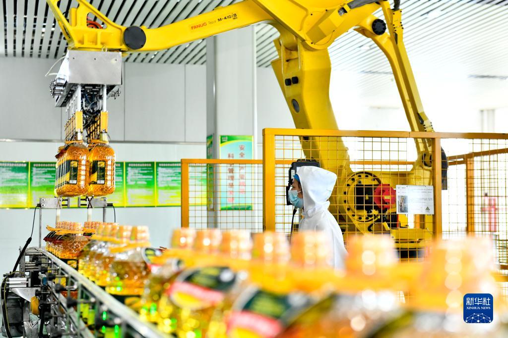 9月13日,在長壽花食品股份有限公司,工業機器人在抓取玉米油。
