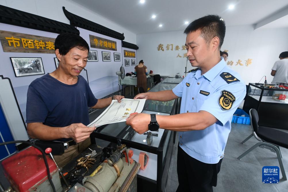 9月14日,在龍泉街道的社區服務便民小店內,市場監管部門工作人員把集中登記、代辦好的營業執照交給商戶黃賢德(左)。新華社記者 徐昱 攝