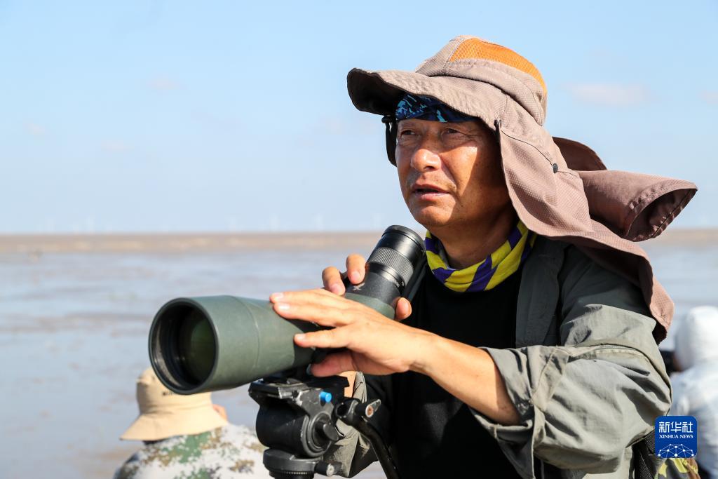 李東明(右)在東&條子泥灘塗上調查拍攝鳥類(2023年8月19日攝)。鳥類調查員、攝影師李東明1963年出生,原本經營着一家圖文社,從2009年開始觀察、拍攝候鳥。2019年,他成為東&條子泥濕地的一名鳥類調查員,起早摸黑,風吹雨打,通過攝影積累了大量圖片與視頻資料,更是多次觀察拍攝到全球僅剩600余只的勺嘴鷸,大家都稱他為“勺子王”“鳥博士”。目前條子泥濕地記錄的412種鳥中,他已拍到200余種。新華社記者 楊磊 攝