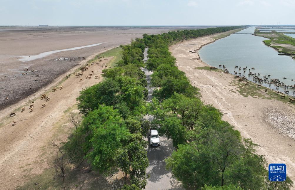 劉彬驅車在保護區巡護(2023年8月21日攝,無人機照片)。1982年出生的劉彬,因鳥與麋鹿結緣。2009年,江蘇大豐麋鹿國家級自然保護區首次發現東方白鸛,正在安徽大學攻讀鳥類學碩士的劉彬跟隨導師來到大豐,保護區的生物多樣性深深吸引了他。同年畢業後,劉彬進入到保護區工作。野外監測,為麋鹿拌飼料,救護受傷、被困麋鹿……這一幹就是14年。作為一名博士,這些年,劉彬一直堅持開展科研工作:為保護區沒有記錄過的鳥類做環志,研究人類活動對野化麋鹿的影響,還與高校合作研發與麋鹿相關的益生菌。新華社記者 季春鵬 攝