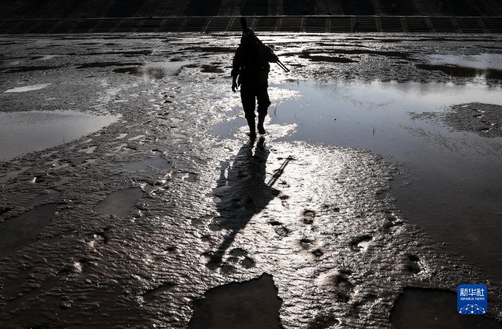 李東明(右)在東&條子泥灘塗上調查拍攝鳥類(2023年8月19日攝)。新華社記者 楊磊 攝