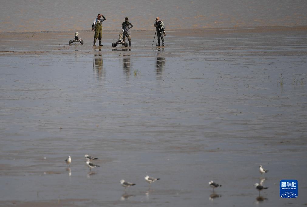 李東明(右一)帶領攝影愛好者在條子泥濕地灘塗上拍鳥(2023年8月31日攝)。新華社記者 季春鵬 攝