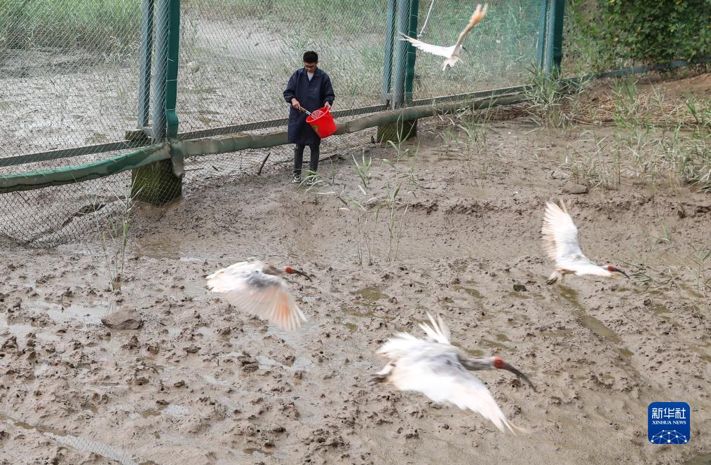 蔡新傑在給朱鹮投放食物(2023年8月21日攝)。新華社記者 楊磊 攝