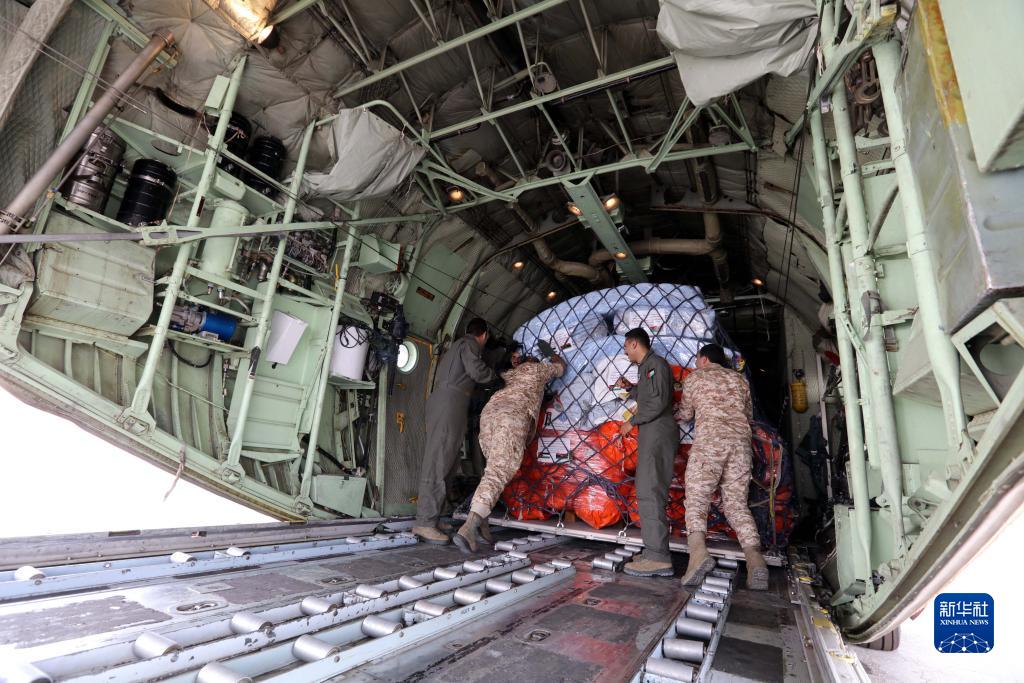 9月13日,工作人員在約旦安曼一軍用機場搬運援助物資。