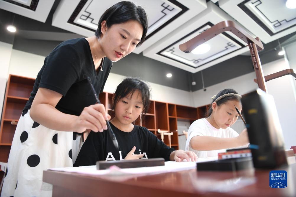 9月13日,雄安史家胡同小學書法老師指導學生練習書法。