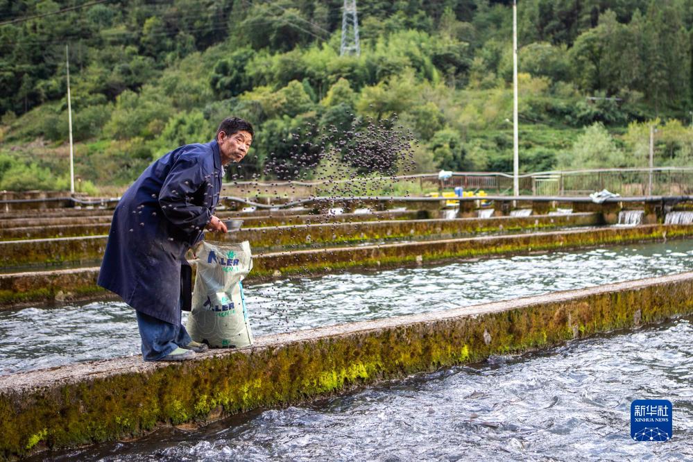 9月13日,在重慶市城口縣蓼子鄉明安村冷水魚産業基地,工人在給虹鱒魚投喂餌料。