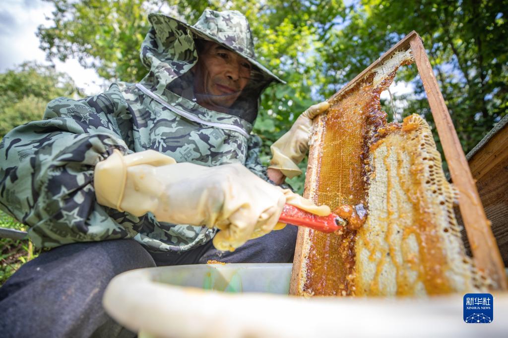 9月13日,在重慶市城口縣巴山鎮農民村,蜂農在采收蜂蜜。