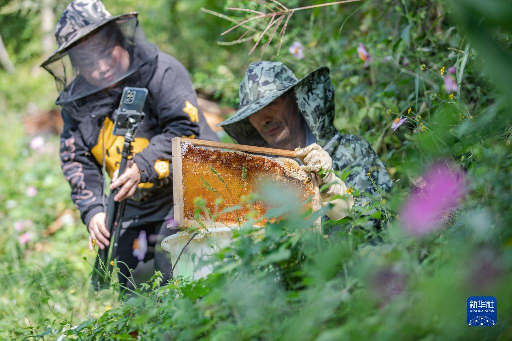 9月13日,在重慶市城口縣巴山鎮農民村,電商主播喻靈芯(左)在直播蜂農采收蜂蜜。