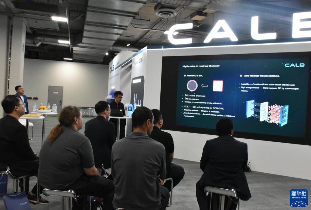 9月12日,在美國拉斯維加斯舉行的北美最大清潔能源展會RE+展會的中國企業中創新航展區,參觀者聽取産品介紹。