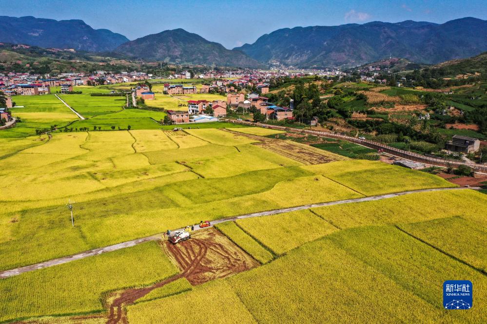金秋時節,重慶市巫山縣廟宇鎮稻穀陸續進入成熟收割期,稻農們搶抓晴好天氣,收割水稻。