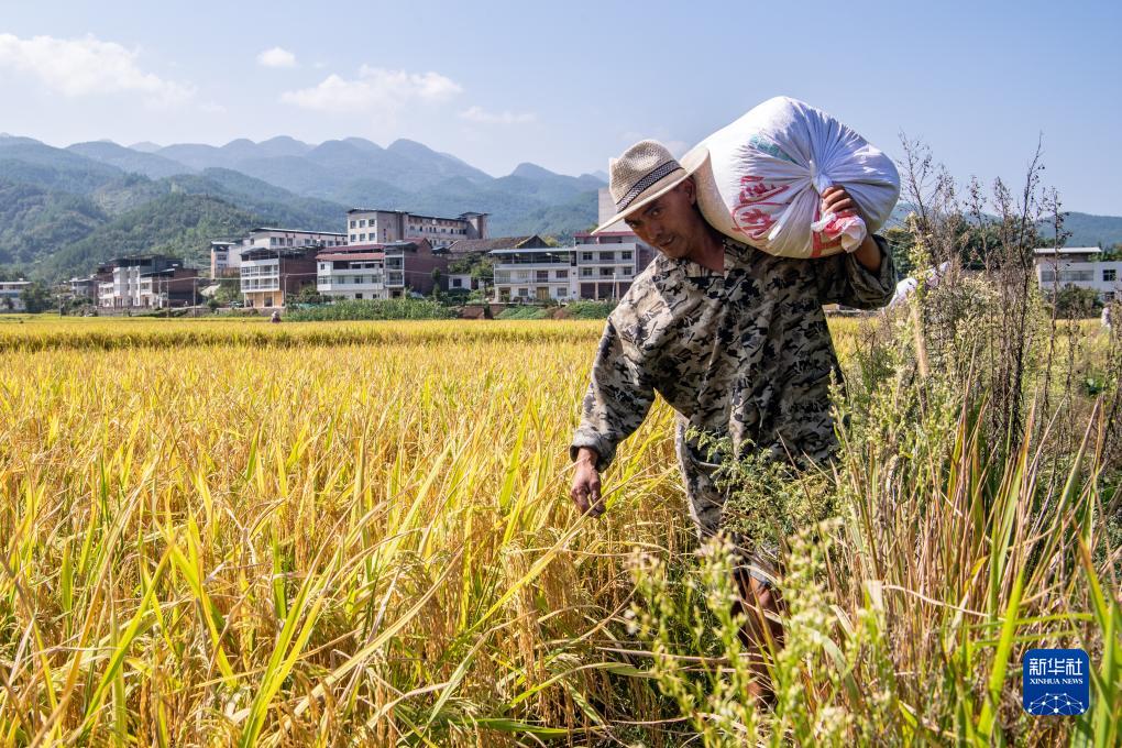 金秋時節,重慶市巫山縣廟宇鎮稻穀陸續進入成熟收割期,稻農們搶抓晴好天氣,收割水稻。
