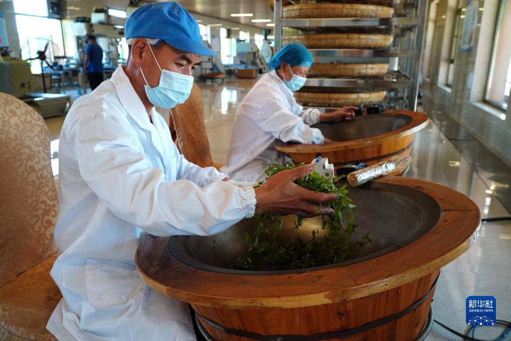 9月14日,在山東省諸城市桃林鎮,茶農在加工採摘的秋茶。