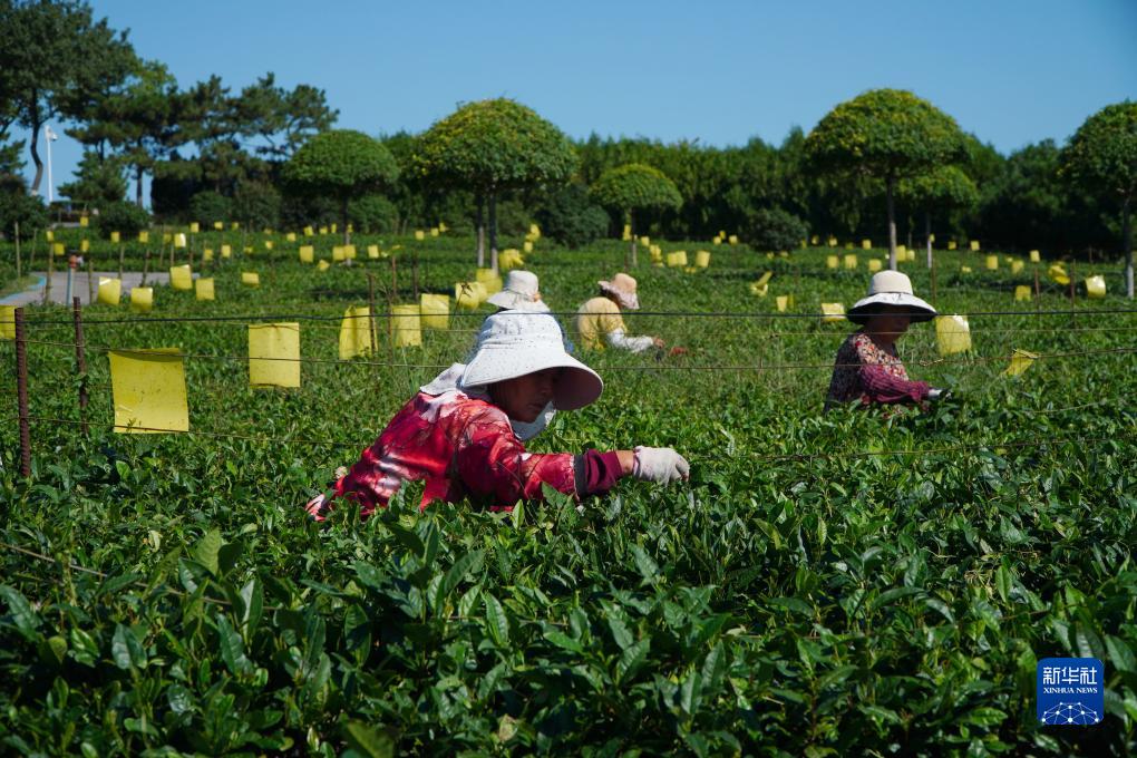 9月14日,在山東省諸城市桃林鎮,茶農在茶園裏採摘秋茶。