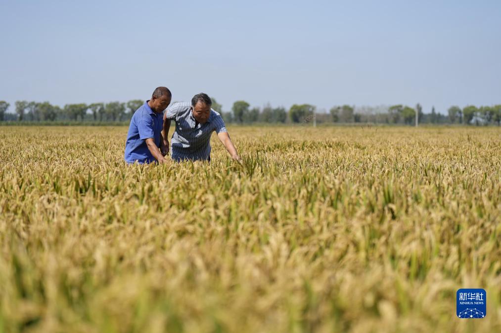 9月14日,河北省樂亭縣古河鄉農民在由鹽鹼地改良而成的水稻田內查看水稻長勢。