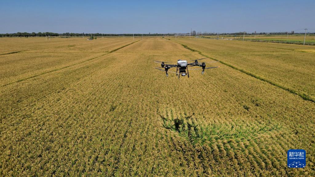 9月14日,在由鹽鹼地改良而成的樂亭縣數字循環農業智慧園區,植保無人機在投放稻田蟹飼料。