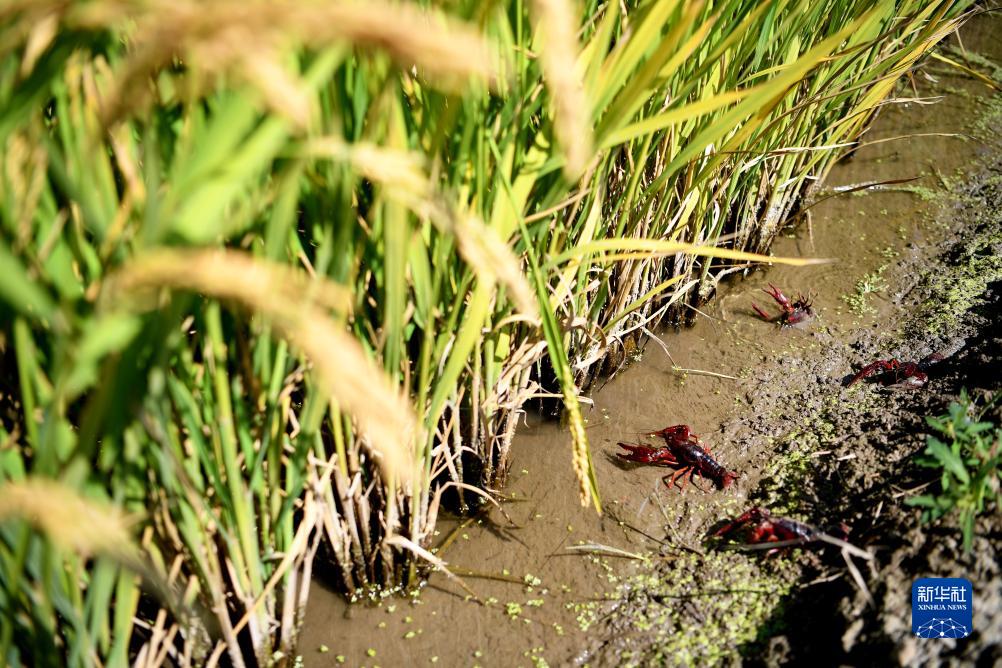 由鹽鹼地改良而成的樂亭縣數字循環農業智慧園區稻蝦共生區內的小龍蝦(9月14日攝)。