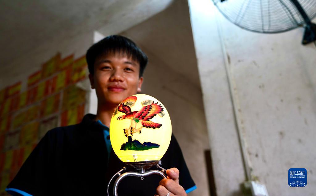 9月13日,吳錦彪展示用鴕鳥蛋製作的燈類産品。新華社記者 胡晨歡 攝