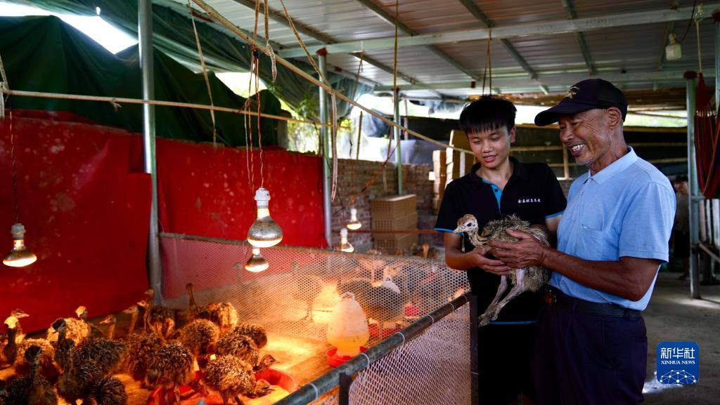 9月13日,吳錦彪(左)給合作社成員賴祥森介紹鴕鳥養殖知識。新華社記者 胡晨歡 攝