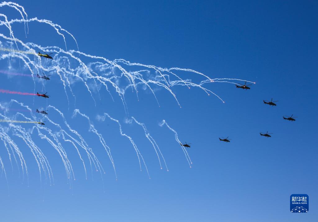 9月14日,在第六屆中國天津國際直升機博覽會開幕式上,陸軍“風雷”飛行表演隊進行通場飛行表演。
