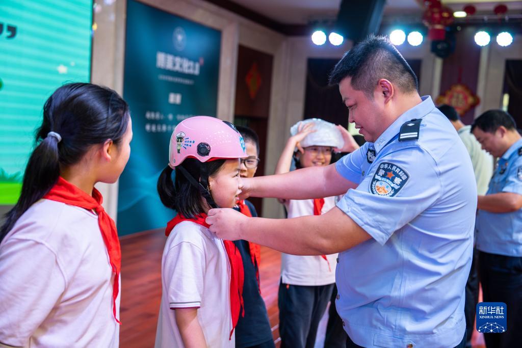 9月14日,在新世博寄宿制小學,交警指導學生佩戴安全頭盔。