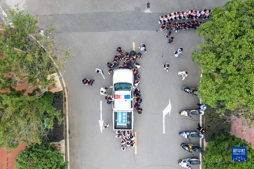 9月14日,在新世博寄宿制小學,學生通過活動了解車輛駕駛視野盲區(無人機照片)。