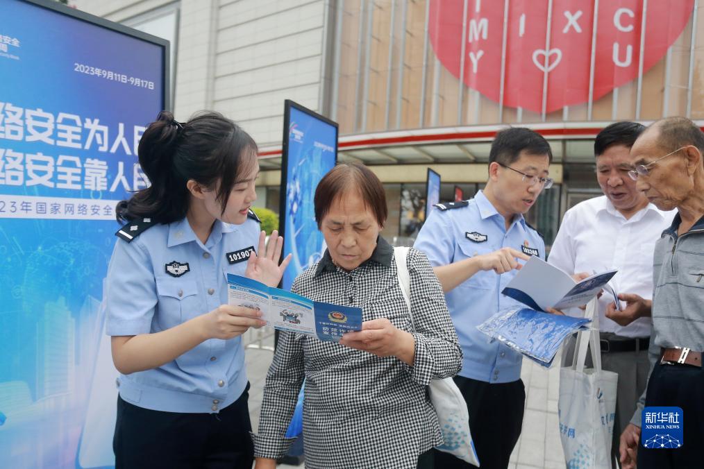 9月14日,在江蘇省揚州市邗江區雙橋街道的廣場上,民警向人們講解網絡安全和防範電信詐騙的知識。