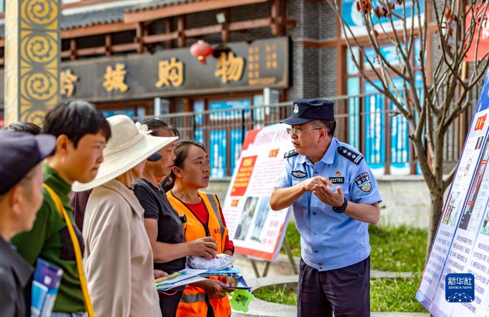 9月14日,民警在貴州省黔西市錦繡街道的廣場上向人們講解網絡安全知識。