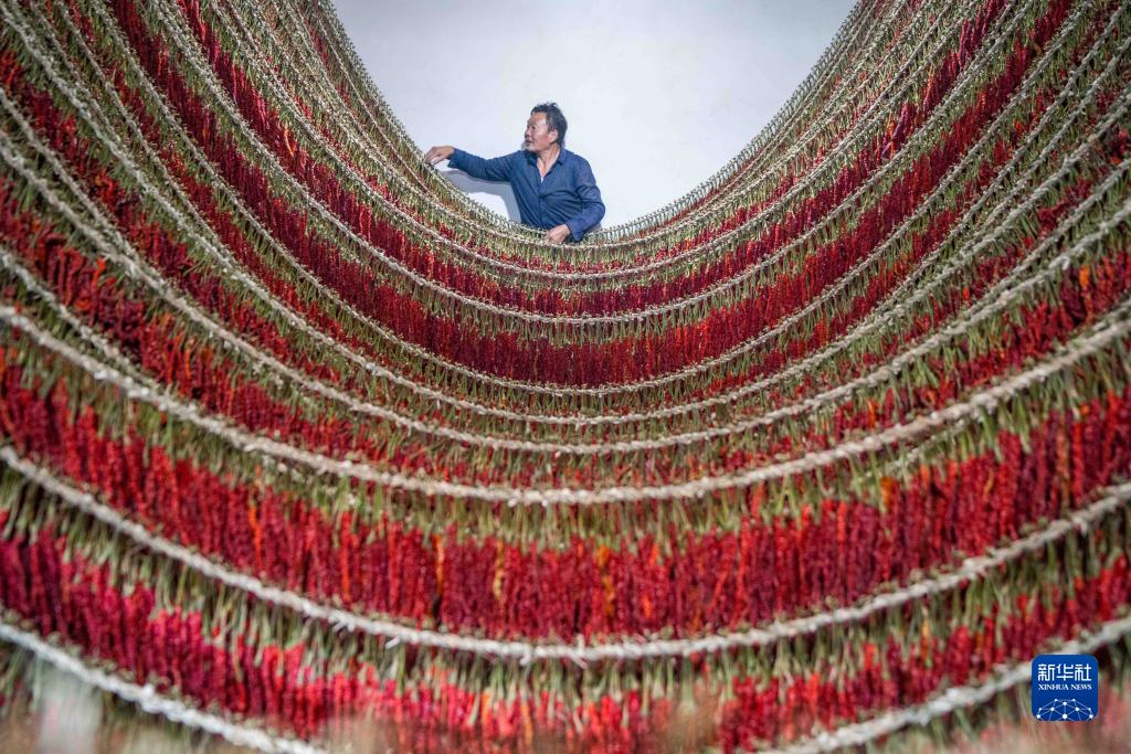 9月13日,村民在貴州省畢節市大方縣理化鄉金雞村查看辣椒烘乾情況。
