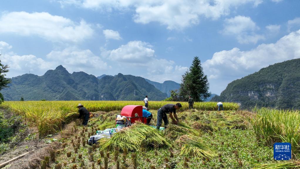 9月14日,重慶市酉陽土家族苗族自治縣楠木鄉紅莊村村民在高山稻田裏收割水稻。