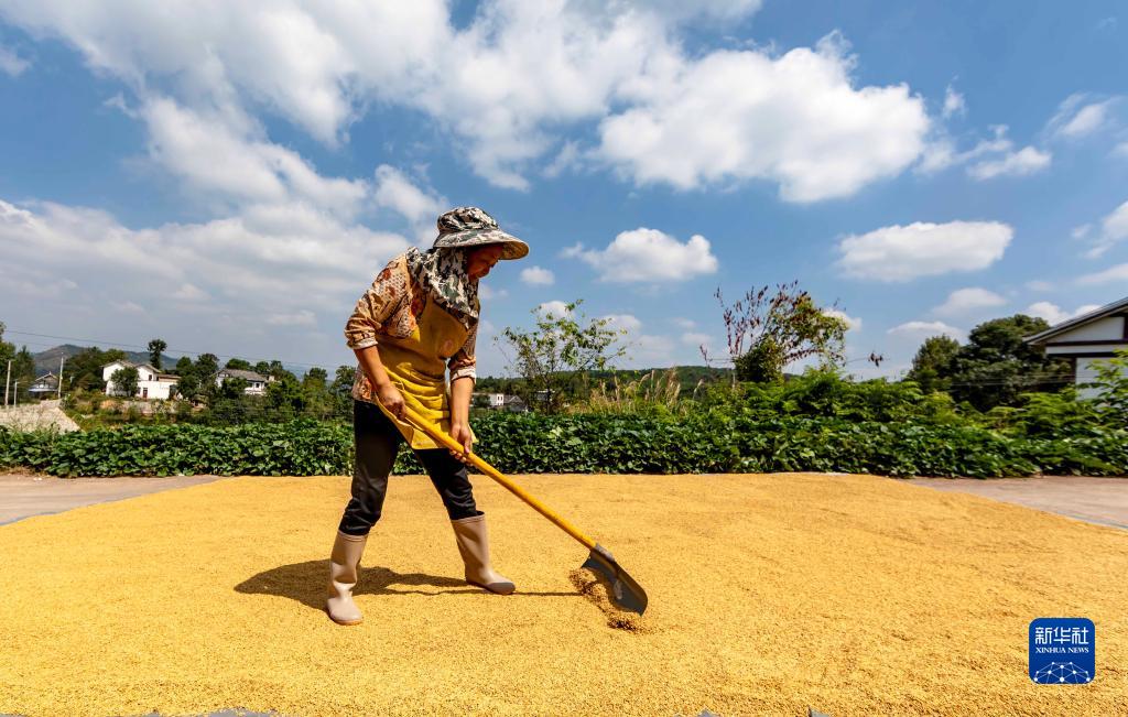 9月15日,村民在貴州省黔西市錦星鎮洪湖村晾曬稻穀。