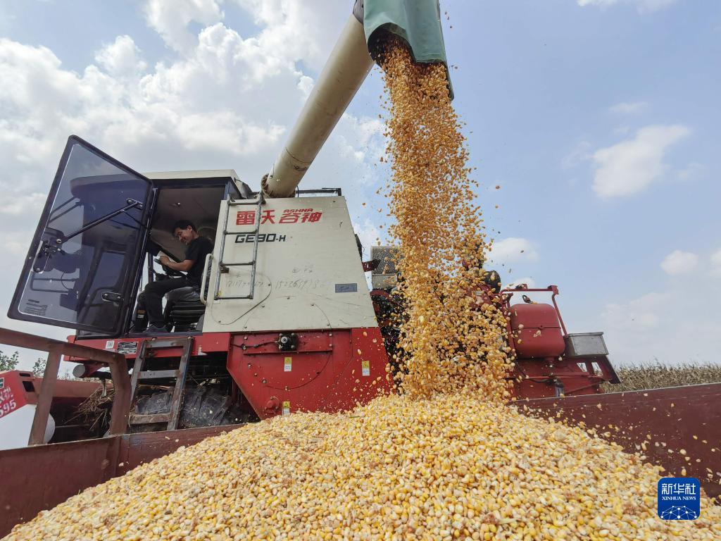 9月14日,農民駕駛農機在河南省駐馬店市汝南縣羅店鎮袁莊村收穫成熟的玉米。
