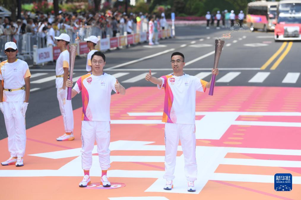 9月15日,火炬手陳飛(右)和蔡相理在火炬傳遞中。