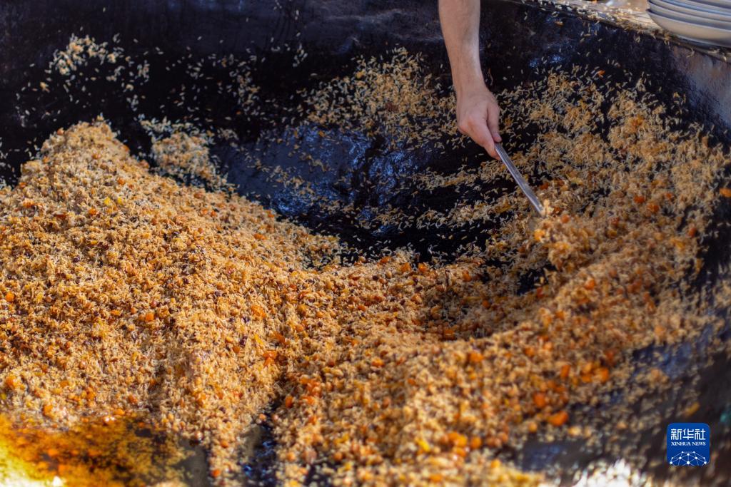 9月13日,在烏茲別克斯坦首都塔什幹,工作人員給抓飯裝盤。