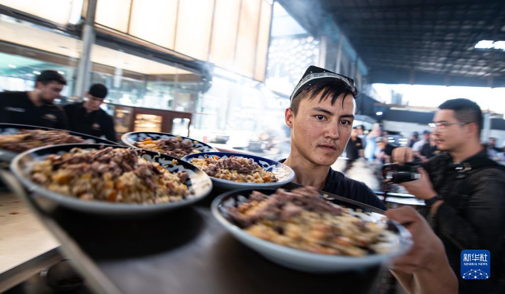 9月14日,在烏茲別克斯坦首都塔什幹,工作人員運送抓飯。