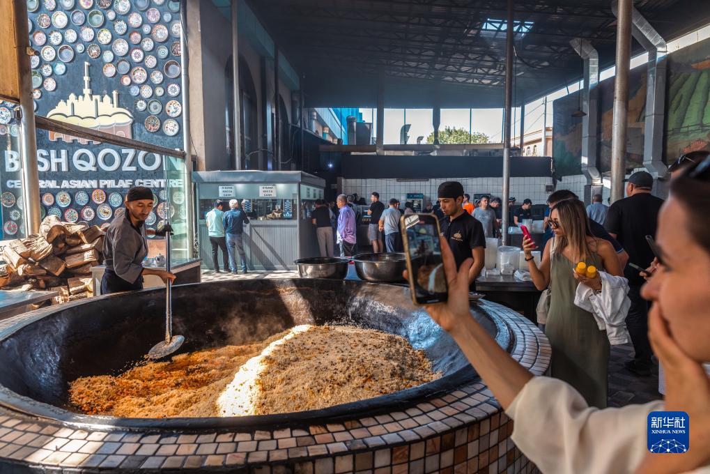 9月14日,在烏茲別克斯坦首都塔什幹,中亞抓飯中心主廚(左一)製作抓飯。