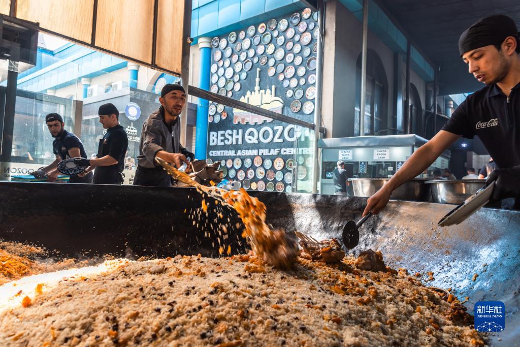 9月14日,在烏茲別克斯坦首都塔什幹,中亞抓飯中心主廚(左三)製作抓飯。