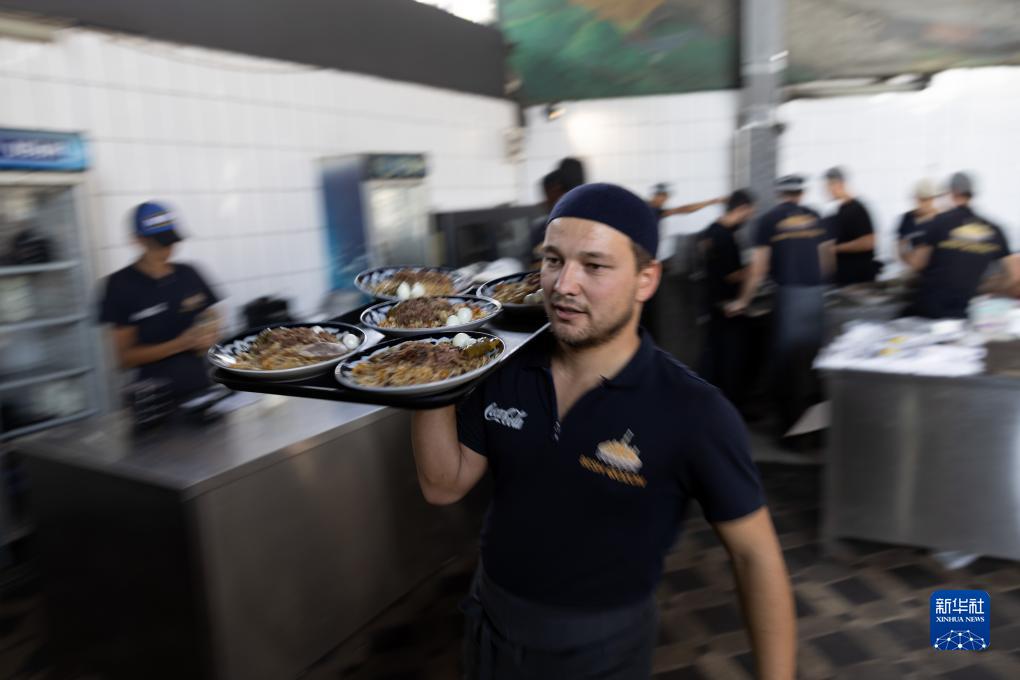 9月13日,在烏茲別克斯坦首都塔什幹,工作人員運送抓飯。