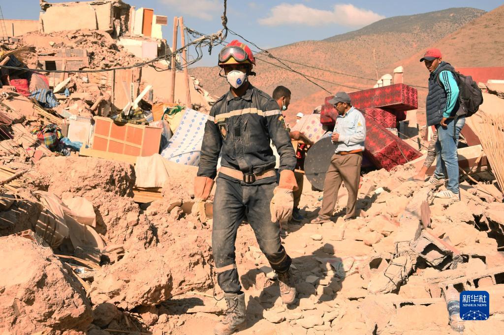 9月14日,救援人員在位於摩洛哥豪茲省的伊姆利勒村的地震廢墟上搜救。