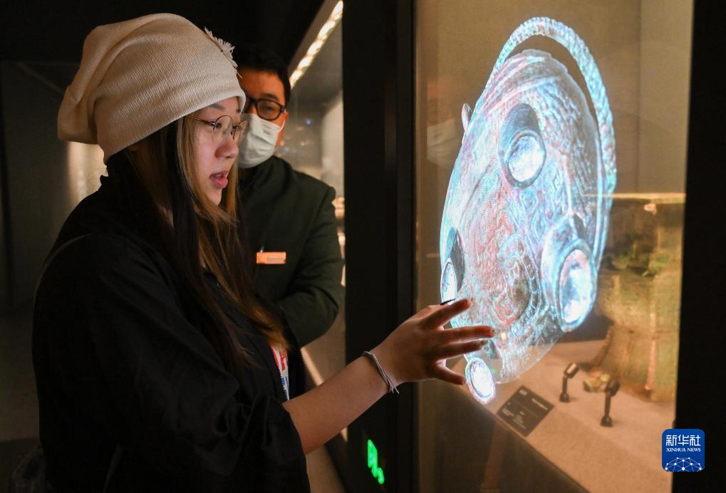 9月15日,一位觀眾在館內展區的互動屏幕上的體驗沉浸式參觀的樂趣。