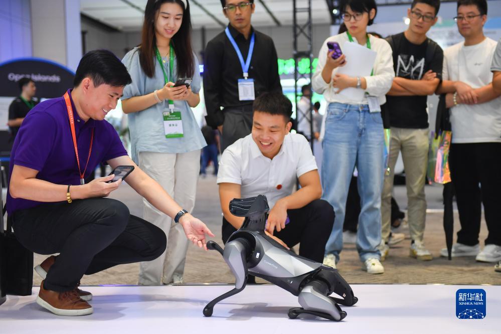 9月15日,參觀者在2023世界計算大會專題展上了解機器狗並與其互動。