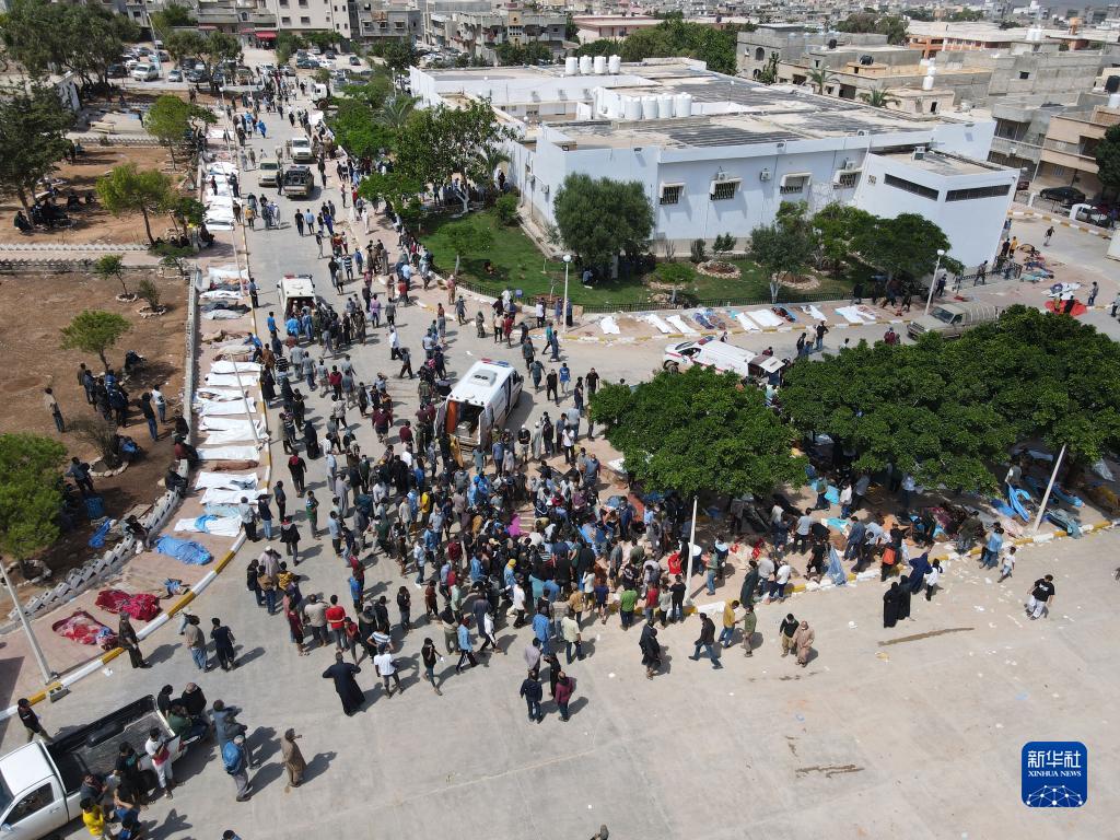 9月14日,在利比亞東部城市德爾納,人們聚集在遇難者遺體旁。
